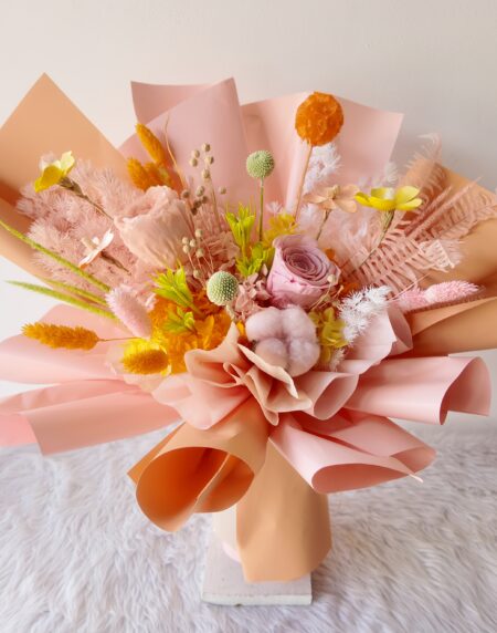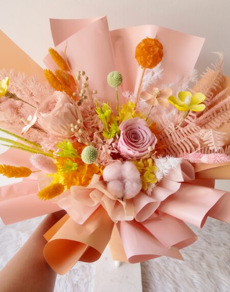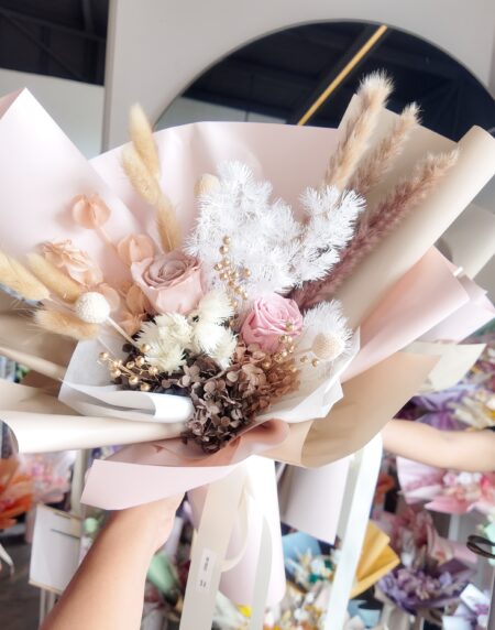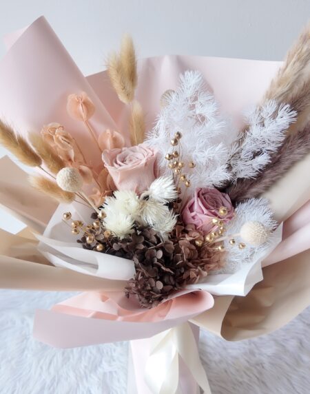 Blush is a small bouquet of dried flowers in pink to express adoration.